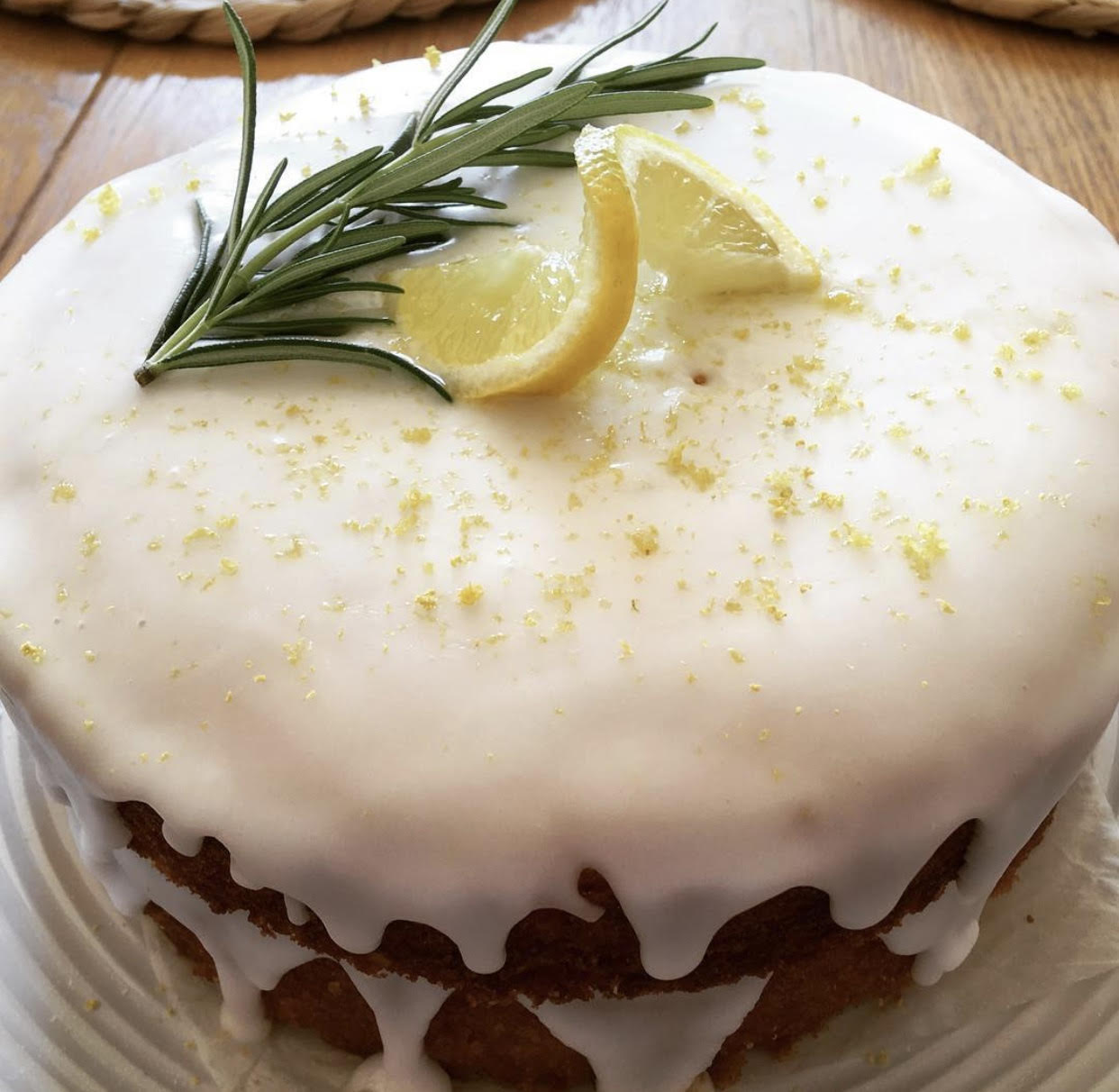 Once completely cooled, mix the sifted icing sugar with the lemon juice and pour over the cake (dripping over the sides is fine!). Once the icing’s almost set but not quite firm, cut a line halfway into a slice of lemon, twist and arrange on the cake, along with a sprig of rosemary.